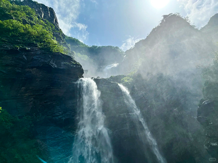 三叠泉是庐山的标志性景点之一,有 “不到三叠泉,不算庐山客” 之说。它由大月山、五老峰的涧水汇合,从大月山流出,经过五老峰背,由北崖悬口注入大盘石上,又飞泻到二级大盘石,再喷洒至三级盘石,形成三叠。每叠各具特色,上级如飘雪拖练,中级如碎玉摧冰,下级如玉龙走潭,仰看与俯视各蔚为壮观。