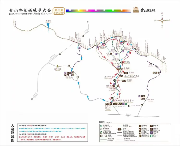 金山岭长城中心入口--景区检票口---桃春口--砖垛口--沙岭口--小金山--后川口--景区检票口--金山岭长城游客中心大厅(开幕式地方)