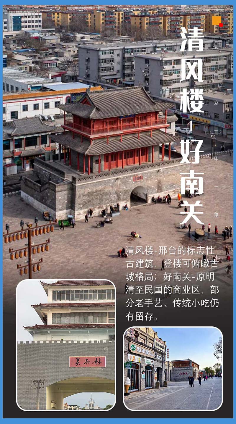 - 早餐后我们去邢州古城,它是黄河以北地区建城最早的 “第一古城”,有 3500 多年建城史,素有 “燕赵第一城” 之誉。随后打卡清风楼-好南关,清风楼位于邢州古城中轴线上,是中国北方现存最为完整的古楼之一。好南关集美食、购物、娱乐于一体,在这里,你能品尝地道邢襄风味,选购特色文创好物,感受邢台的热闹与活力。