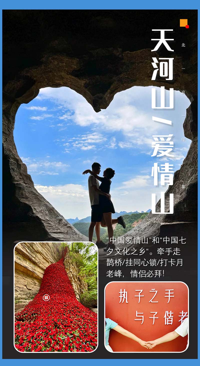 天河山被誉为 “中国爱情山”。它是牛郎织女传说的原生地,首推爱情广场,象征爱情的雕塑屹立于此,满是浪漫氛围。鹊桥横跨两山,相传是牛郎织女相会处,情侣必至,祈愿爱情长久,情人谷谷内溪水潺潺、绿树成荫,漫步其间,甜蜜无限。月老峰上的月老殿不容错过,可求姻缘红线。另外,锅穴奇观也值得一看,独特地质景观为景区添一抹神奇色彩。来此能沉浸式感受爱情文化,留下难忘回忆 。