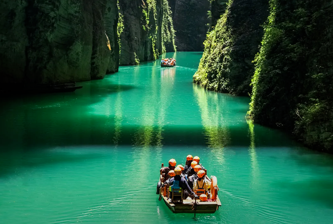 - 晴日里,阳光折射水面,泛舟其上如凌空悬浮,仙气飘飘;雨天时,谷内温差催生薄雾,云雾缭绕间,宛若闯入缥缈仙境。