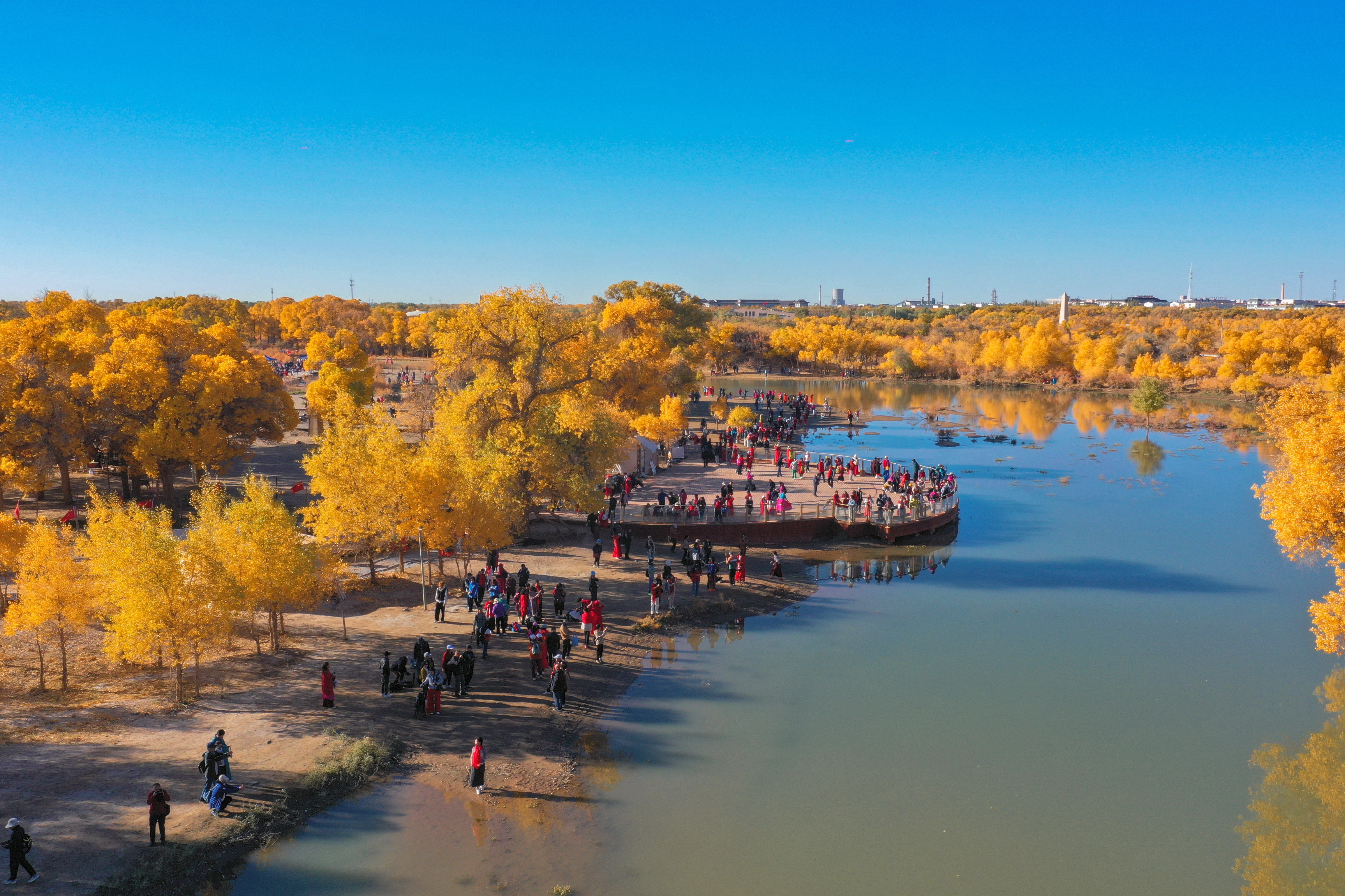 10月初秋风过后,大片胡杨由翠绿转成金黄,与湛蓝的天空,共同筑就了一幅亮丽、神奇的秋色油画,分外夺目灿烂。