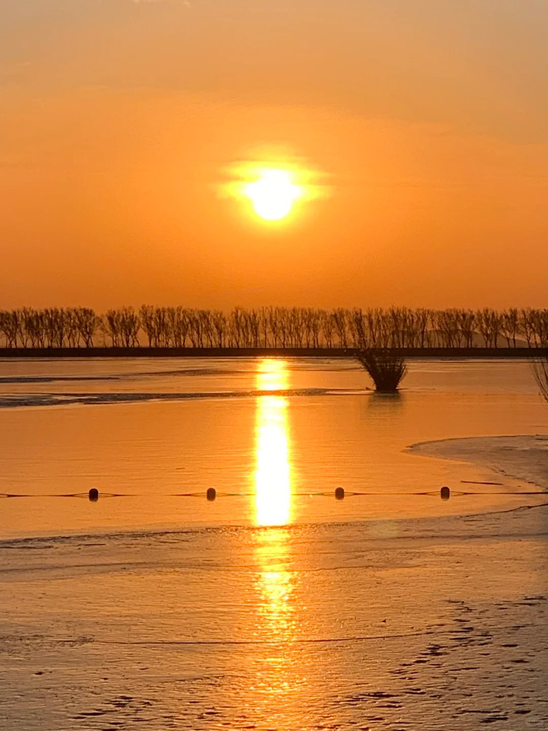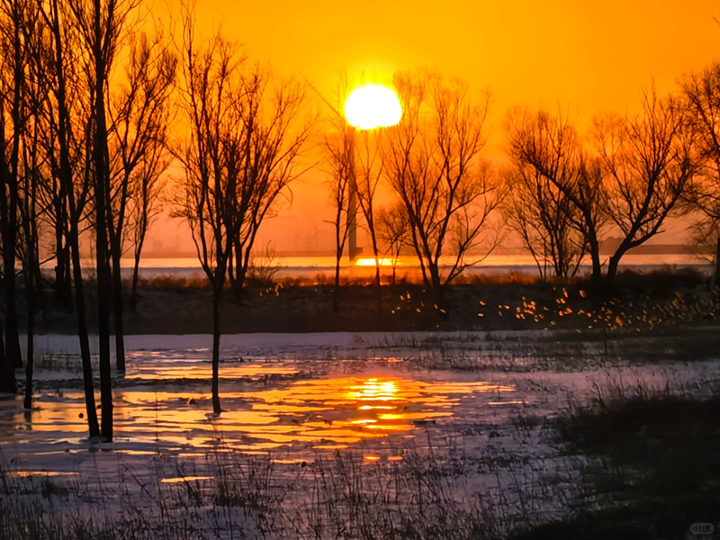 野鸭湖的绝美日落大片,太阳缓缓沉下时,整片湖面被染成了金红色,像洒满碎金的绸缎一样耀眼。湖里的栈道被淹到一半,只能在岸边走走,也因此看到了更多倒影与色彩的细节。