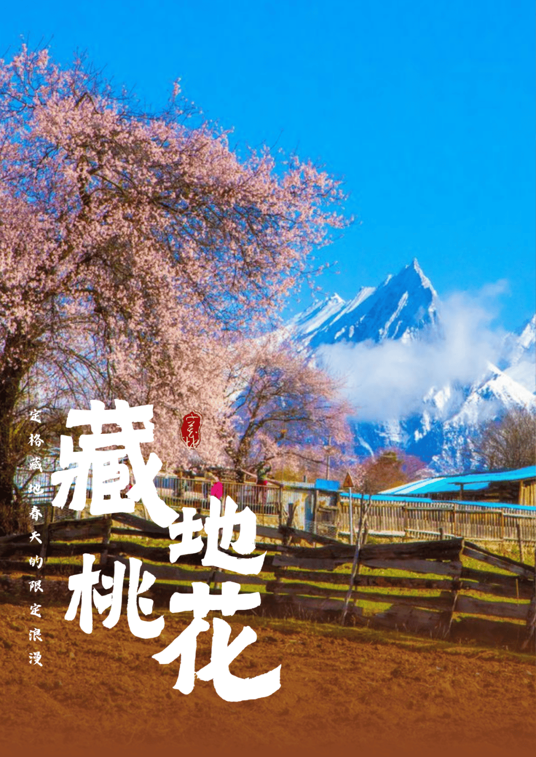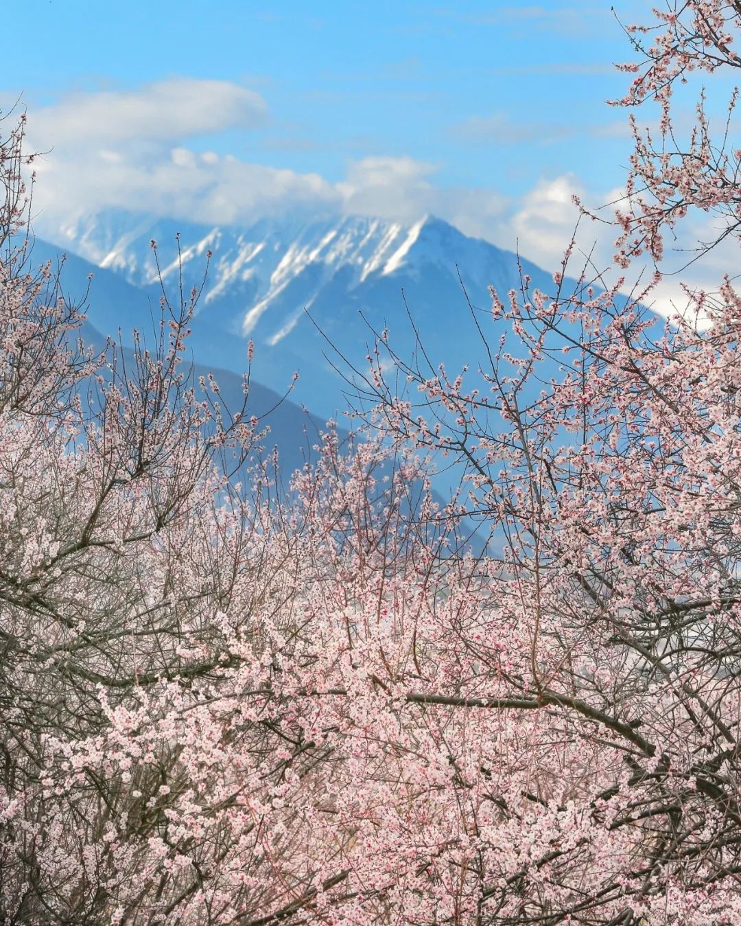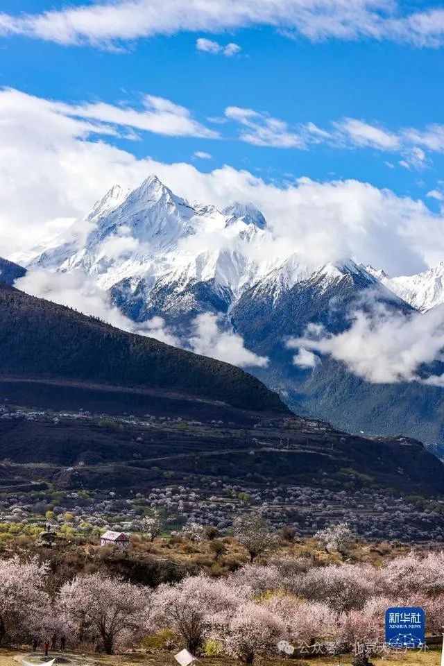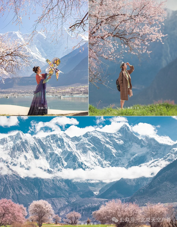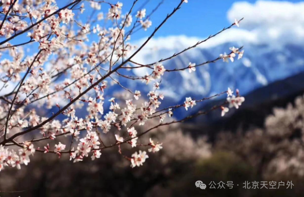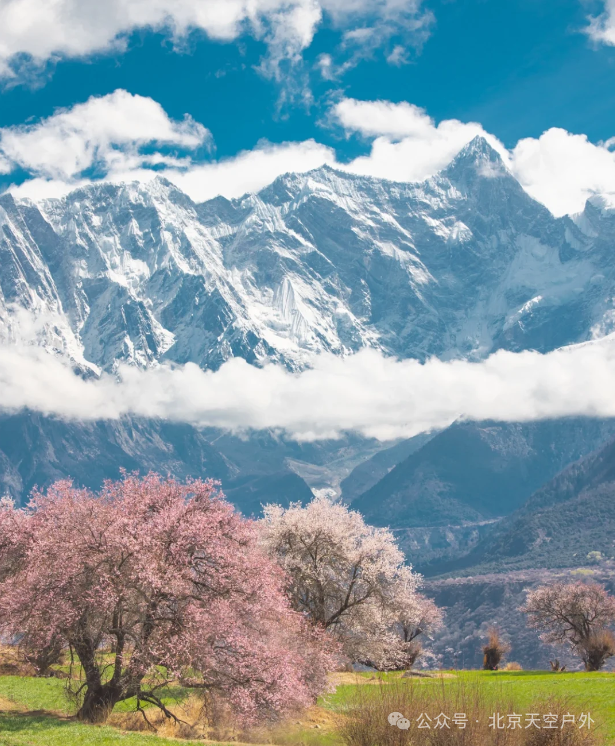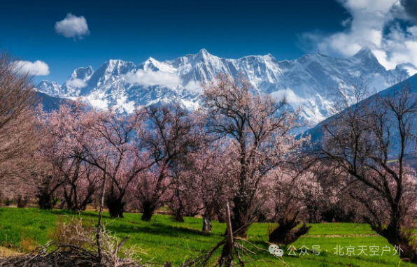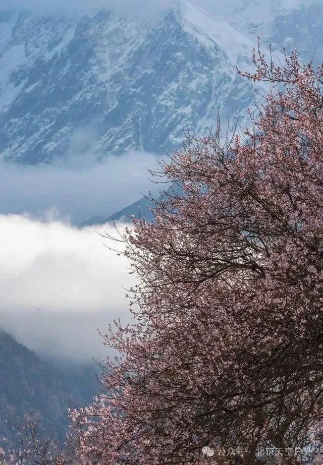 桃花掩映下的雪山之景