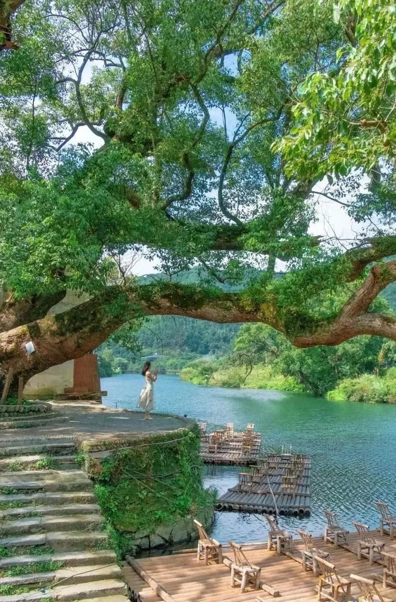 『上坦村』 从这里开始走,这是一个非常特别且有韵味的地方。它不是那种人潮汹涌的热门景区,而是一个静谧、古朴、充满电影感和生活气息的“世外桃源”。冯小刚导演的电影《我不是潘金莲》中,女主角李雪莲的老家“老家小镇”主要就在这里取景。范冰冰饰演的角色居住的那栋临河徽派老宅(挂有“光明茶厂”牌匾)已成为标志性打卡点。电影让这个默默无闻的小村庄走进了大众视野。清澈的星江河呈“C”字形环绕村庄,河水碧绿如翡翠,平静如镜面,完美倒映着白墙黛瓦和马头墙。村口一棵巨大的樟树,枝繁叶茂,屹立千年,是村庄的守护神,也是村民和游客休憩、拍照的中心。